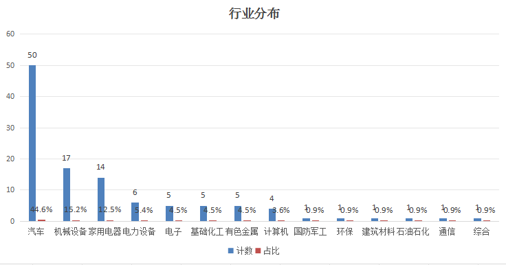 从行业分布看,根据申万一级分类,涉及14个不同行业。其中,汽车有50只成分股,占比44.6%;机械设备有17只成分股,占比15.2%;家用电器有14只成分股,占比12.5%;电力设备有6只成分股,占比5.4%。