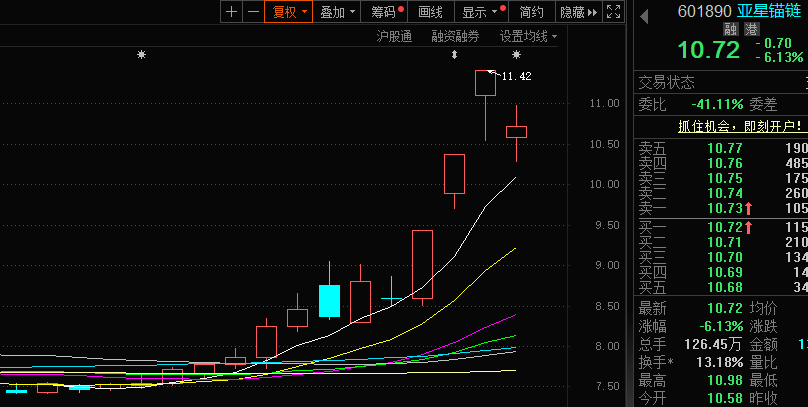 近期,深海科技概念持续活跃。亚星锚链是全球最大的锚链生产企业,公司自主研发的r5级海洋系泊链打破国外技术垄断,其产品可应用于海上风电、海洋石油平台等领域。因在深海科技领域的实力出众,亚星锚链的潜力被资金不断挖掘出来。