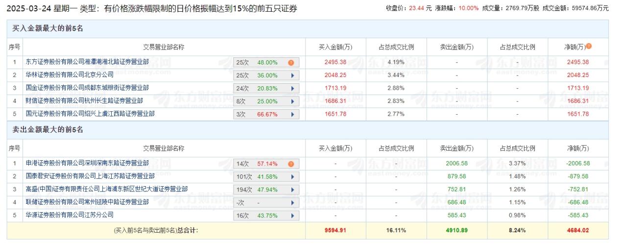 3月24日,买入方面,东方证券湘潭湖湘北路以2495.38万元的净买入额居首,华林证券北京分公司净买入2048.25万元。国金证券成都东城根街和西湖国贸分别净买入1713.19万元和1686.31万元。此外,国元证券绍兴上虞江西路也贡献了1651.78万元的净买入;