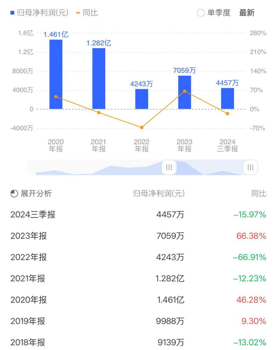 根据财报,2024前三季度,公司实现营收2.68亿元,同比下降4.44%;净利润4457万元,同比下降15.97%。此外,2021年至2023年,公司净利润分别为1.28亿元、4242.81万元、7059.28万元;同比分别下滑12.23%、66.91%,和同比上涨66.38%。