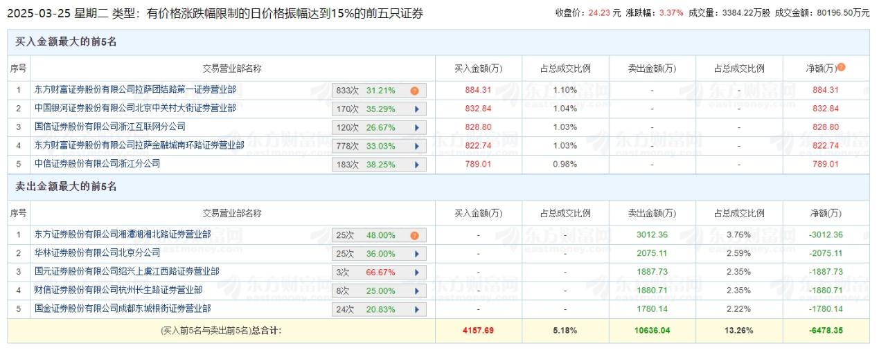 其中,3月25日,买入方面,t王买入884.31万元,北京中关村买入832.84万元,国信证券浙江互联网分公司买入828.80万元,中信证券浙江分公司买入789.01万元;