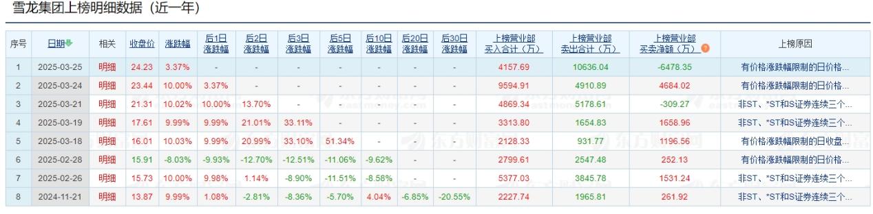 根据f10,今年以来,雪龙集团已7次登上龙虎榜,且较集中在3月份,整体买卖净额为正。