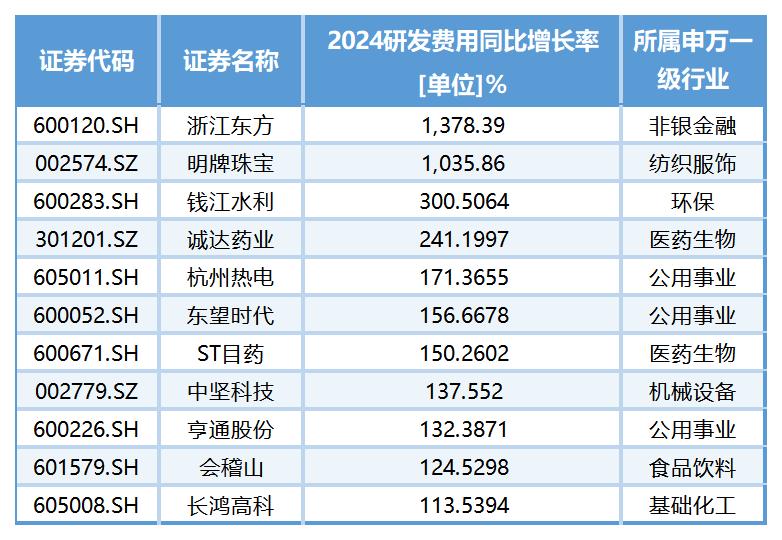 从投入增速看,2024年,浙股中有44家公司研发费用同比增长超过40%;有26家公司研发费用同比增长超过50%;11家公司研发费用同比增长超过100%,具体包括浙江东方、明牌珠宝、钱江水利、诚达药业、杭州热电、东望时代、st目药、中坚科技、亨通股份、会稽山、长鸿高科。