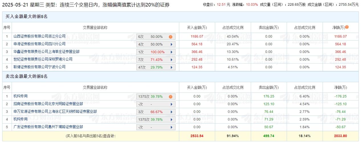 5月21日,山西证券浙江分公司买入1186.07万元,申港证券四川分公司买入564.18万元,炒股养家买入366.46万元,世纪证券深圳罗湖买入联储证券宁波分公司买入292.48万元,124.35万元;卖出席位中,机构专用卖出176.25万元,招商证券北京光明路卖出125.10万元,申万宏源上海徐汇区天钥桥路卖出76.44万元,广发证券惠州下埔路卖出50.67万元。整体来看,买入力量较强。