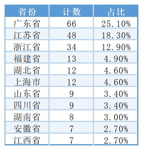 从地域分布看,按照省份划分,广东有66家,占比25.1%;江苏有48家,占比18.3%;浙江有34家,占比12.9%。
