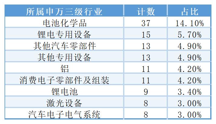 从行业分布看,根据申万三级行业分类,电池化学品有37家,占比14.1%;锂电专用设备有15家,占比5.7%;其他汽车零部件、其他专用设备各有13家,占比4.9%;铝、消费电子零部件及组装各有11家,占比4.2%。
