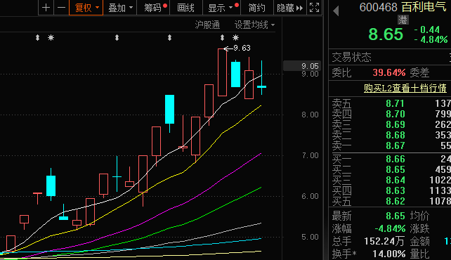 自5月16日首板涨停开始,百利电气的股价震荡拉升,股价由4.66元/股涨至最高9.63元/股,近1个月累计上涨近90%。