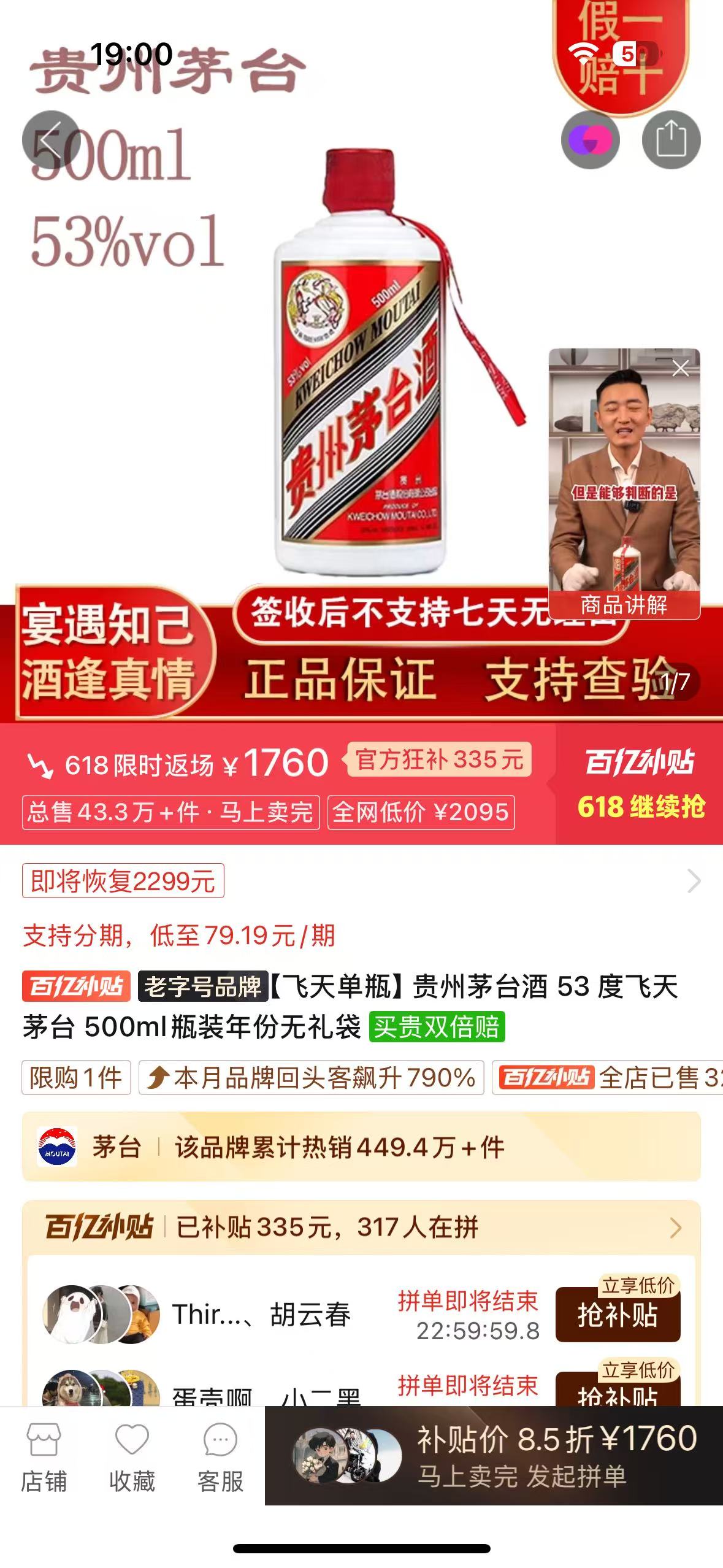 线上价格同步走低,25日拼多多平台飞天茅台售价已低至1760元/瓶。