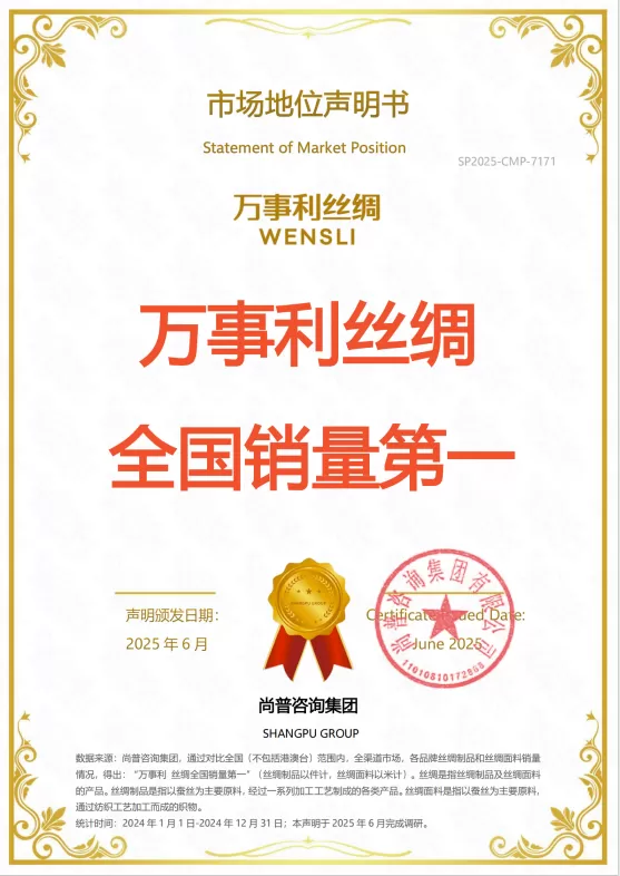 适逢公司创立50周年之际,万事利交出了一份里程碑式的成绩单——以丝绸品类全国销量第一的佳绩获得权威认证。这不仅是广大消费者对万事利丝绸深厚信赖与认可的体现,更进一步巩固了其在行业中的领军地位。