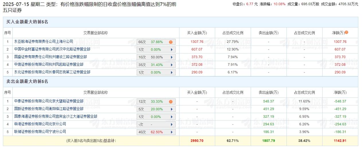7月15日,则因价格涨跌幅限制的日收盘价格涨幅偏离值达到7%登榜。
