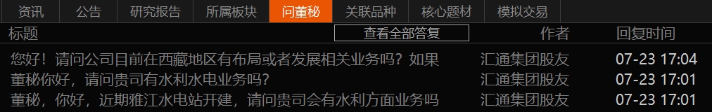 因此,部分投资人在互动中向汇通集团提问,“公司目前是否有在西藏地区有布局或者发展相关业务”“公司是否有参与雅江水电站工程项目”。但公司并未直接正面回答投资者的问题,只表示,会根据经营现状寻找合适的水利水电建设项目。
