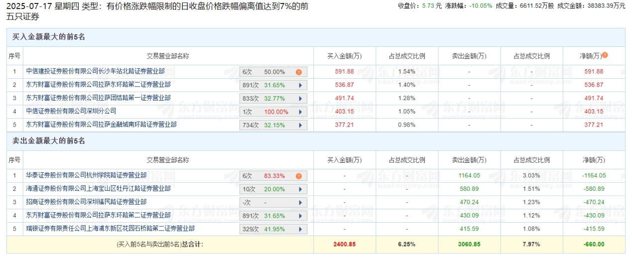 7月17日,汇通集团同样作为价格涨跌幅限制的日收盘价格跌幅偏离值达到7%的前五只证券而登榜。