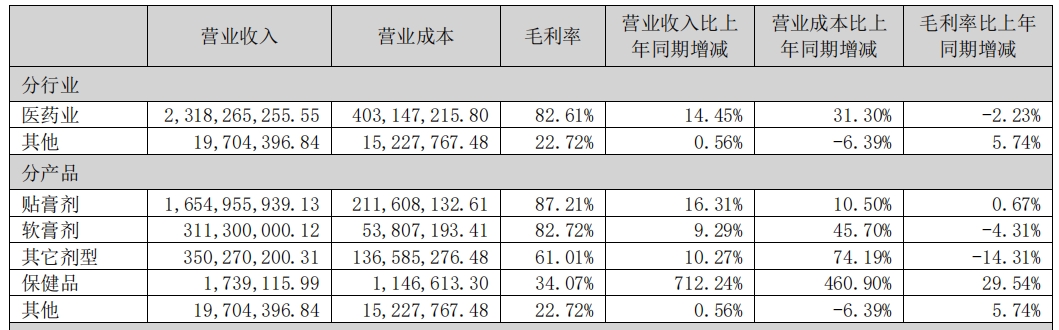 2024年,膏药剂产品实现营收16.55亿元,同比增长16.31%;软膏剂产品实现营收3.11亿元,同比增长9.29%;其他剂型产品实现营收3.50亿元,同比增长10.27%;保健品实现营收0.017亿元,同比增长712.24%。另有部分其他产品实现营收0.20亿元,同比增长0.56%。