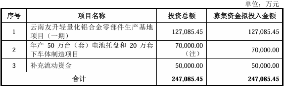 友升股份:本次拟公开发行股份数量不超过4,826.7111万普通股,拟投入募资247,085.45万元,用于1.云南友升轻量化铝合金零部件生产基地项目(一期) 2.年产50万台(套)电池托盘和20万套下车体制造项目 3.补充流动资金。
