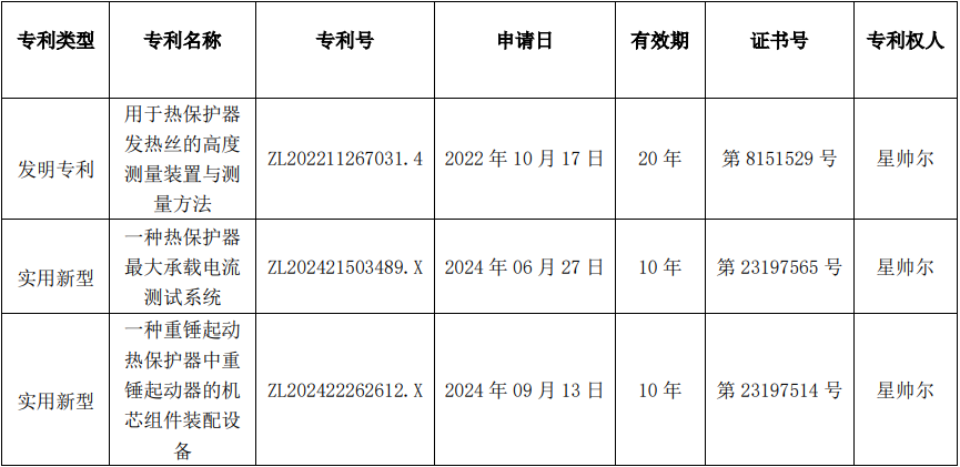 览富财经网讯:8月15日,星帅尔(002860.sz)发布公告称,公司于近日取得由国家知识产权局颁发的《发明专利证书》和《实用新型专利证书》,专利名称分别为用于热保护器发热丝的高度测量装置与测量方法、一种热保护器最大承载电流测试系统,以及一种重锤起动热保护器中重锤起动器的机芯组件装配设备。