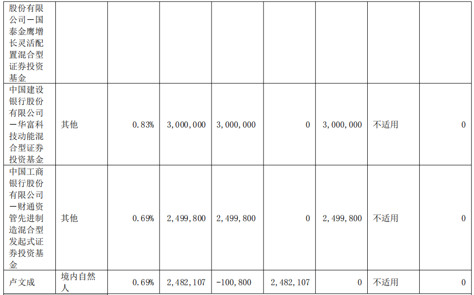 中国建设银行股份有限公司一华富科技动能混合型证券投资基金持股比例0.83%,报告期末持股数量3,000,000股;