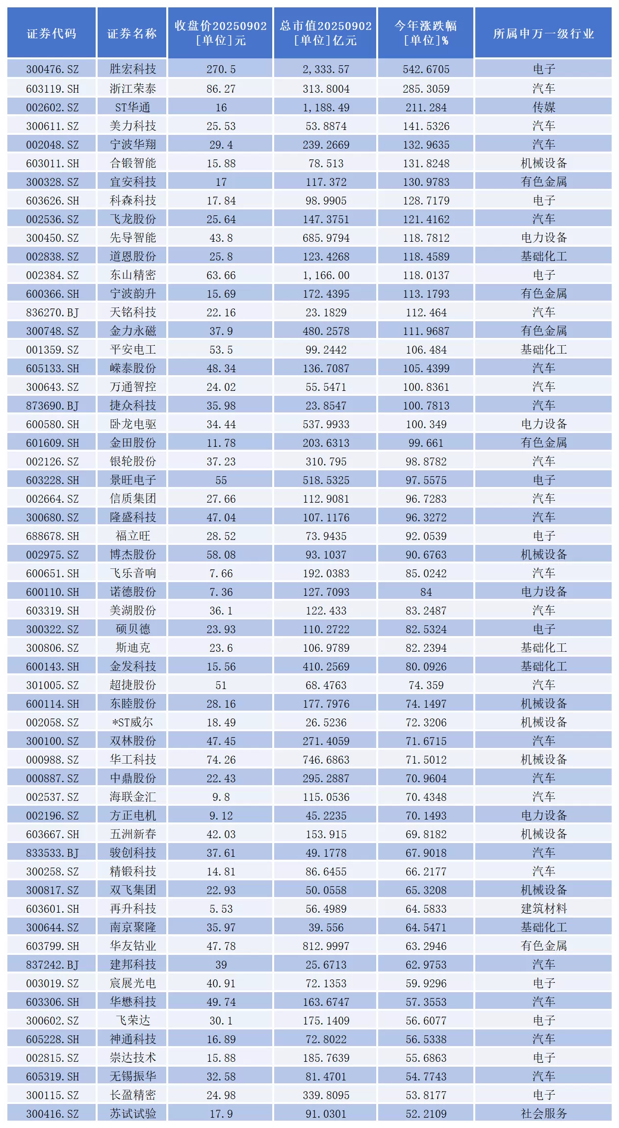 其中,胜宏科技、浙江荣泰、st华通、美力科技、宁波华翔、合锻智能、宜安科技、科森科技、飞龙股份、先导智能、道恩股份、东山精密、宁波韵升、天铭科技、金力永磁、平安电工、嵘泰股份、万通智控、捷众科技、卧龙电驱等20家上市公司股价已经成功实现翻倍。