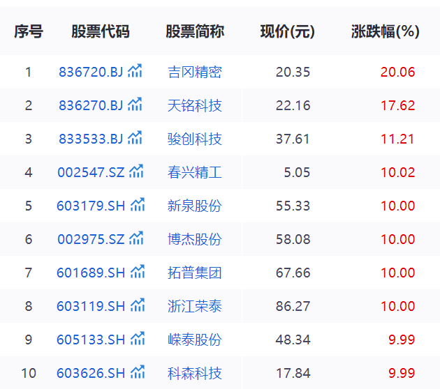 9月2日下午,特斯拉概念板块异动,截至收盘,吉冈精密(836720.bj)、春兴精工(002547.sz)、博杰股份(002975.sz)、新泉股份(603179.sh)、拓普集团(601689.sh)、浙江荣泰(603119.sh)、嵘泰股份(605133.sh)、科森科技(603626.sh)等多股涨停,天铭科技(836270.bj)、骏创科技(833533.bj)涨超10%,超捷股份(301005.sz)、泰德股份(831278.bj)、先导智能(300450.sz)、五洲新春(603667.sh)等涨超7%。