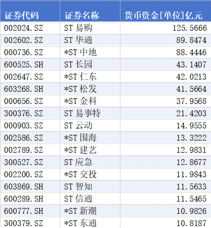 其他st公司当中,st华通、*st中地、st长园、*st仁东、*st松发、*st金科、st易事特、st云动、*st围海、*st建艺、st应急、*st交投、st智知、st信通、*st新潮、*st东通,加上st易购,共有17家st公司在手货币资金金额均超10亿元。