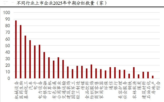 从申万一级行业看,2025年中期机械设备、医药生物、基础化工、汽车、电力设备、电子、非银金融等行业的分红企业数量较多,并且都超过了50家。从分红企业数量占比看,非银金融、美容护理、银行业中企业分红意愿较高,中期实施或宣告分红的企业占比均在40%以上。此外,石油石化、公用事业、交通运输行业分红企业占比超过20%。
