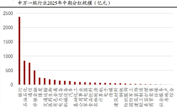 在申万一级行业中,2025年中期银行、石油石化、通信等行业分红规模排名靠前,综合、房地产、社会服务等行业分红规模偏低。其中,六大国有银行中期实施或宣告分红金额超过200亿元。