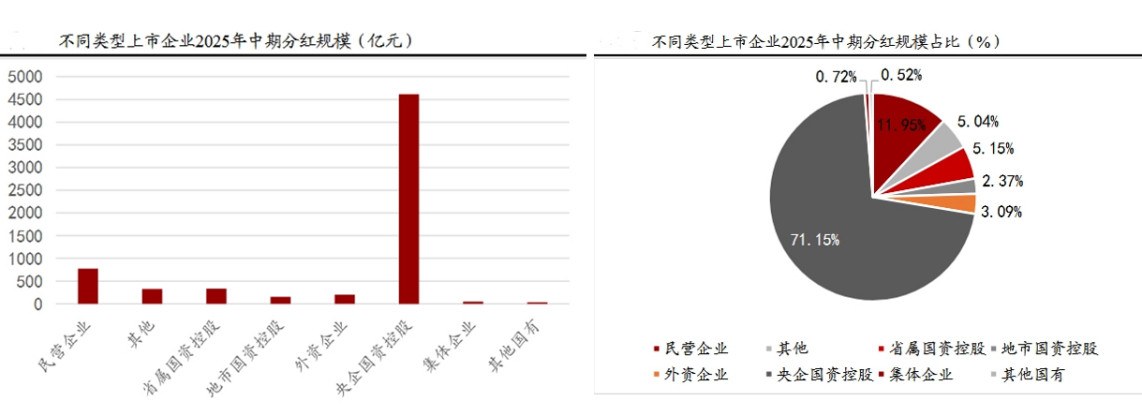 从分红情况来看,489家央企国资控股企业中有116家宣告或实施分红,占比达到23.72%,较去年同期有所提高。从分红金额看,2025年央企分红金额达到4610亿元,同比增长5.13%,占全部分红金额的比例超过70%。