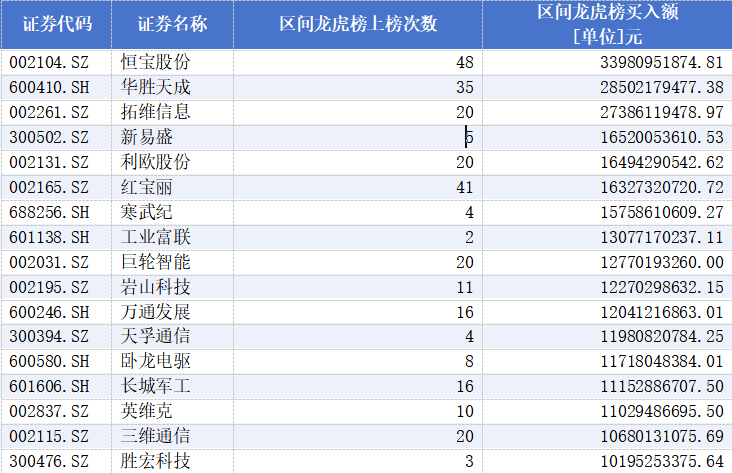 从区间买入金额来看,最多的仍是恒宝股份,此外,超过100亿元的个股还有华胜天成、拓维信息、新易盛、利欧股份、红宝丽、寒武纪、工业富联、巨轮智能、岩山科技、万通发展、天孚通信、卧龙电驱、长城军工、英维克、三维通信、胜宏科技。