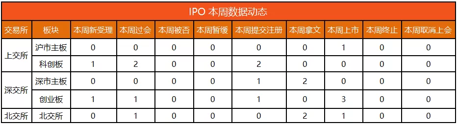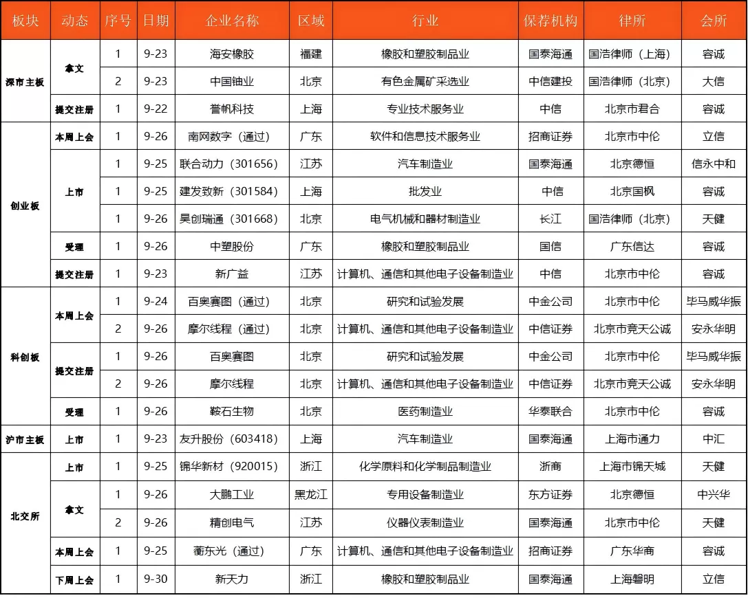 览富财经网统计,9月22日-9月28日,2家企业受理,4家企业首发上会获通过,4家企业提交注册,4家企业顺利拿到批文,5家企业成功上市,下周首发上会企业1家。