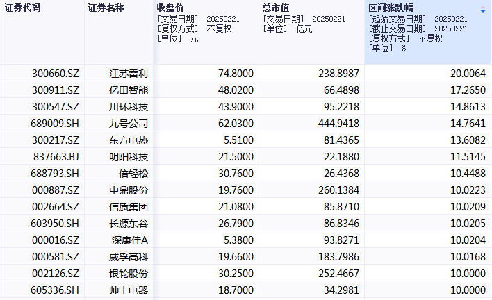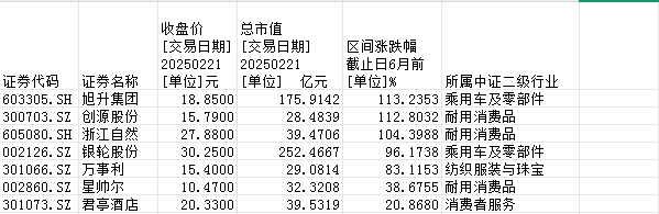 其中,慧翰股份、双林股份、安徽凤凰、北特科技、富临精工、宏海科技、日出东方、江苏雷利、建设工业、川环科技、松发股份、英搏尔、肇民科技、林泰新材、酷特智能15家公司涨幅超过200%。
