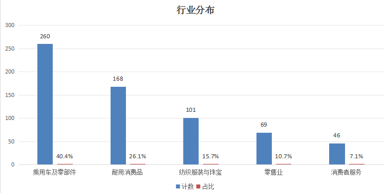 从行业分布看,根据中证二级行业分类,乘用车及零部件260家,占比40.4%;耐用消费品168家,占比26.1%;纺织服装与珠宝101家,占比15.7%;零售业69家,占比10.7%;消费者服务46家,占比7.1%。