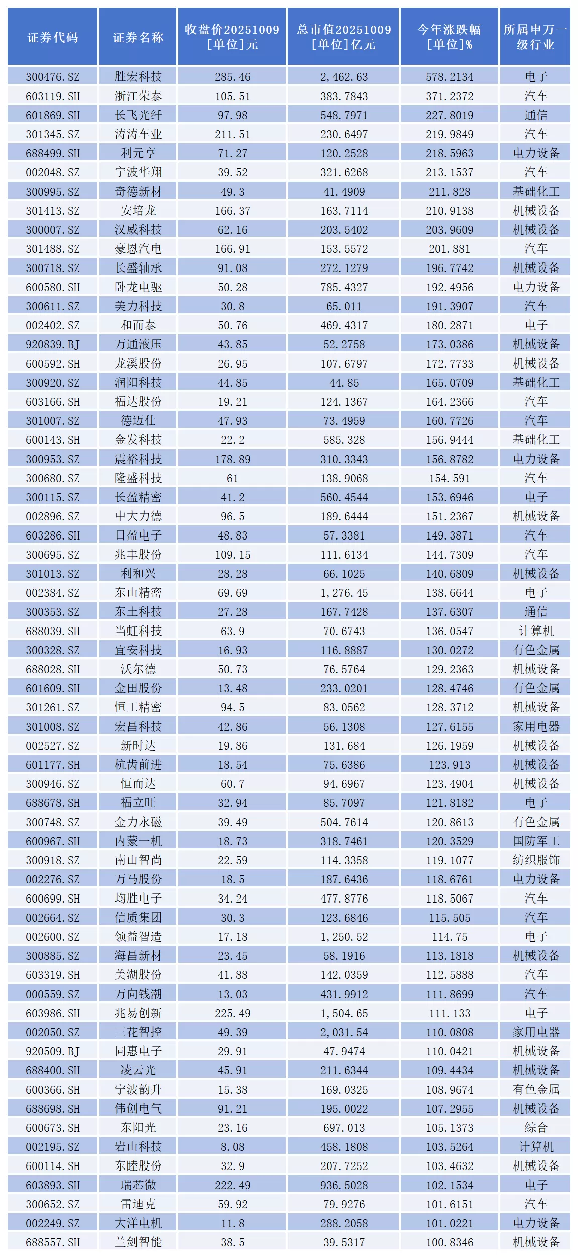 其中,胜宏科技(300476.sz)、浙江荣泰(603119.sh)、长飞光纤(601869.sh)、涛涛车业(301345.sz)、利元亨(688499.sh)、宁波华翔(002048.sz)、奇德新材(300995.sz)、安培龙(301413.sz)、汉威科技(300007.sz)、豪恩汽电(301488.sz)10家公司股价涨幅均超200%。
