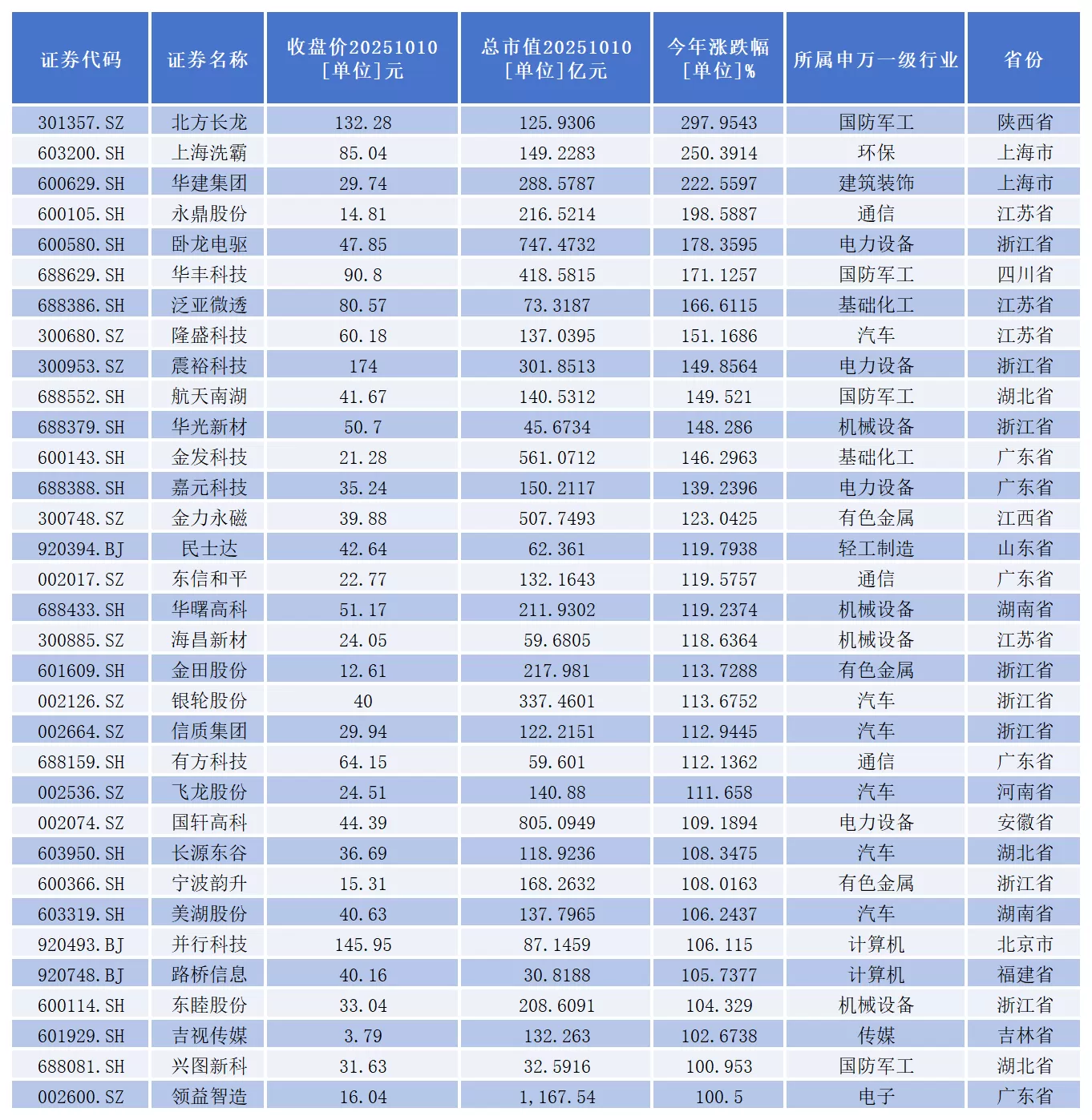 从二级市场表现看,截至10月10日收盘,今年以来,已有33家上市公司股价成功实现翻倍。其中,北方长龙(301357.sz)、上海洗霸(603200.sh)、华建集团(600629.sh)3家公司股价涨幅均超过200%。