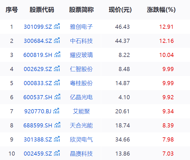 截至收盘,仁智股份(002629.sz)、粤桂股份(000833.sz)涨停,雅创电子(301099.sz)、中石科技(300684.sz)涨超10%,爱旭股份(600732.sh)、东方日升(300118.sz)纷纷跟涨。