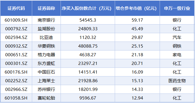 从上市公司股东增持的金额来看,有14家公司股东增持金额超过10亿元,包括南京银行(601009.sh)、盐湖股份(000792.sz)、比亚迪(002594.sz)、华菱钢铁(000932.sz)、格力电器(000651.sz)等公司。其中,南京银行股东增持金额位居榜首,增持金额达到59.14亿元;盐湖股份、比亚迪股东增持金额分别为45.49亿元、29.87亿元,分别位列第二和第三。