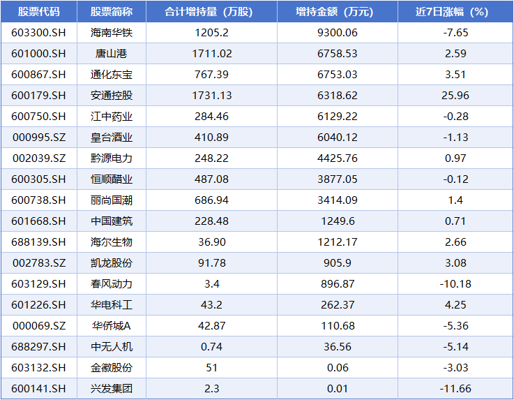 从增持金额来看,近7个交易日增持金额在千万元以上的有9家,增持金额最多的是海南华铁(603300.sh),其间累计增持1205.20万股,增持金额合计9300.06万元;其次是唐山港(601000.sh),其间累计增持1711.02万股,增持金额合计6758.53万元;通化东宝(600867.sh)获股东增持6753.03万元,增持金额位居第三。