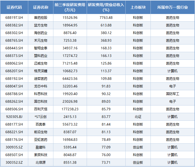值得关注的是,科创板研发强度中位数为12.4%,展现出较强的科技属性,而科创成长层的研发强度中位数更是达到44.3%。较为典型的企业如首药控股-u(688197.sh),其前三季度研发费用达到1.55亿元,而公司总营收却只有200万元。