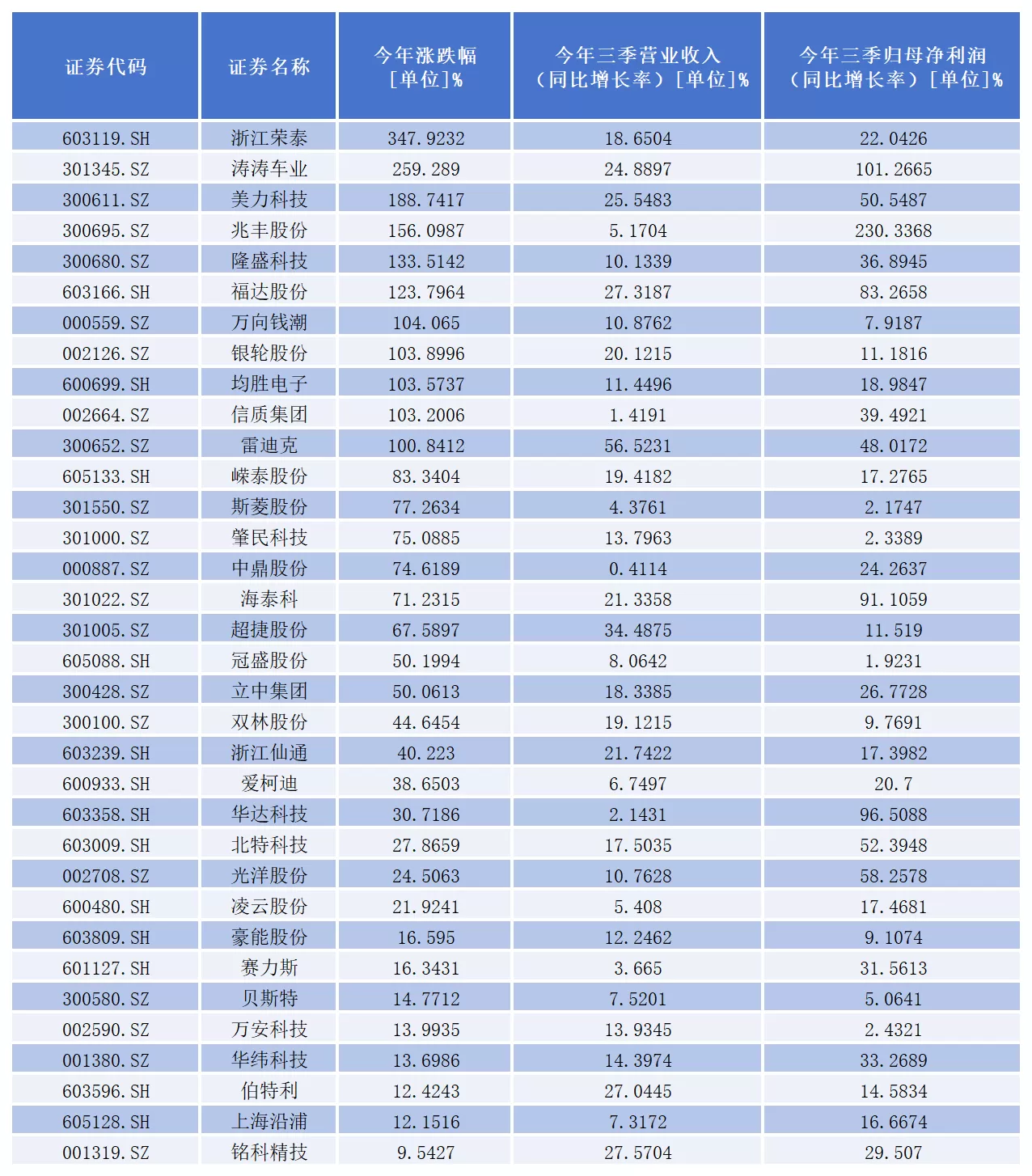 其中,浙江荣泰(603119.sh)、涛涛车业(301345.sz)、美力科技(300611.sz)、兆丰股份(300695.sz)、隆盛科技(300680.sz)、福达股份(603166.sh)、万向钱潮(000559.sz)、银轮股份(002126.sz)、均胜电子(600699.sh)、信质集团(002664.sz)、雷迪克(300652.sz)涨幅均超过100%。