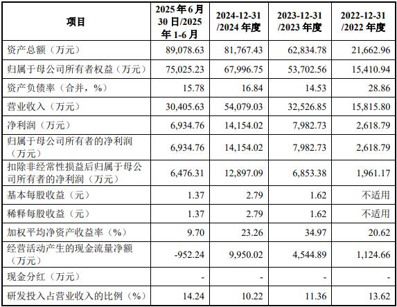 主要财务数据:2022年度-2025年6月末,公司营业收入分别为15,815.80万元、32,526.85万元、54,079.03万元及30,405.63万元,公司归属于母公司股东的净利润分别为 2,618.79万元、7,982.73万元、14,154.02万元和6,934.76万元,扣除非经常性损益后归属于母公司股东的净利润分别为1,961.17万元、6,853.38万元、12,897.09万元和 6,476.31万元。