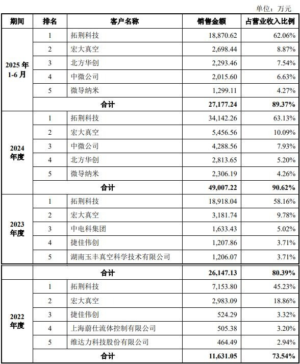 前五大客户:2022年度-2025年6月末,报告期内,公司收入主要来自于半导体设备行业,公司前五大客户产生的收入占主营业务收入的比例分别为73.54%、80.39%、90.62%及 89.37%,其中,公 司向第一大客户拓荆科技的销售收入占比分别为45.23%、58.16%、63.13%。及 62.06%,公司的客户集中度较高。