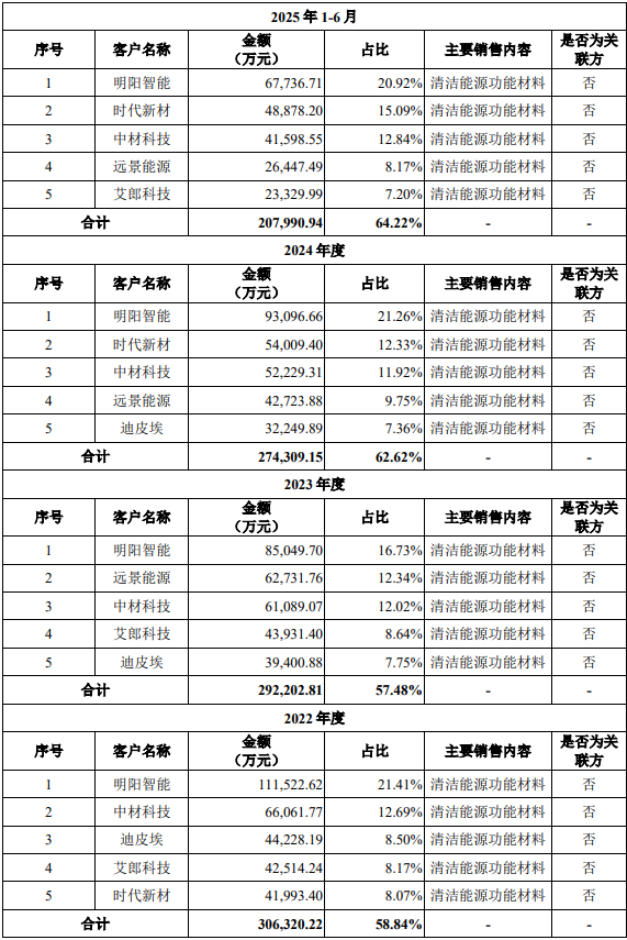 前五大客户:2022年度-2025年6月末,报告期内,公司前五名客户的销售收入占主营业务收入的比例分别为58.84%、57.48%、62.62%及 64.22%。公司客户集中度较高,主要是下游风电整机及叶片行业集中度较高所致。
