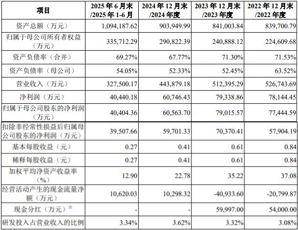 2022年度-2025年6月末,公司营业收入分别为 526,743.69万元、 512,395.29万元、443,879.18万元和 327,500.17万元,归属于母公司净利润分别为 77,444.59万元、79,015.57万元、60,563.70万元和 40,404.36万元。