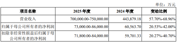 2025年度,公司预计可实现营业收入约700,000.00-750,000.00万元,同比增幅约为57.70%-68.69%;公司预计可实现扣除非经常性损益前后的净利润同比增幅约为20.53%-42.00%和 20.27%-40.70%。