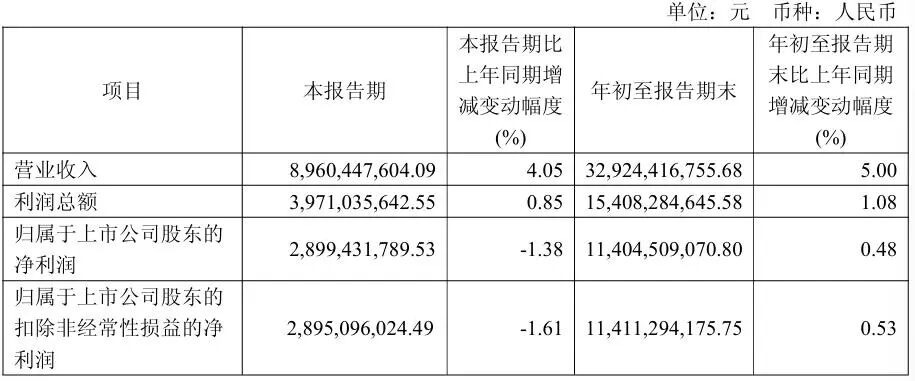 其中,第三季度,山西汾酒实现营业收入89.6亿元,同比增长4.05%;归母净利润为28.99亿元,同比下降1.38%;扣非归母净利润28.95亿元,同比下降1.61%。