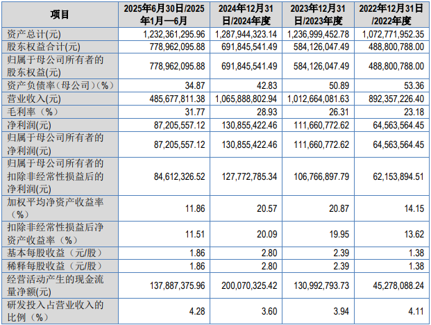 主要财务数据:2022年度、2023年度、2024年度和2025年1-6月,营业收入分别为89,235.72万元、101,266.41万元、106,588.88万元和48,567.78万元,归属于母公司所有者的净利润分别为6,456.36万元、11,166.08万元、13,085.54万元和8,720.56万元。