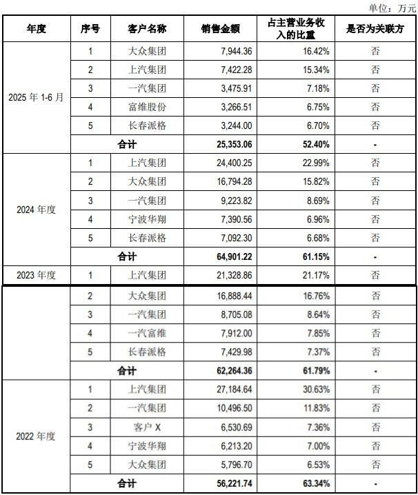 前五大客户:2022年度、2023年度、202年度和2025年1-6月,公司向前五大客户的销售收入占主营业务收入的比例分别为 63.34%、 61.79%、61.15%和 52.40%,客户集中度较高。