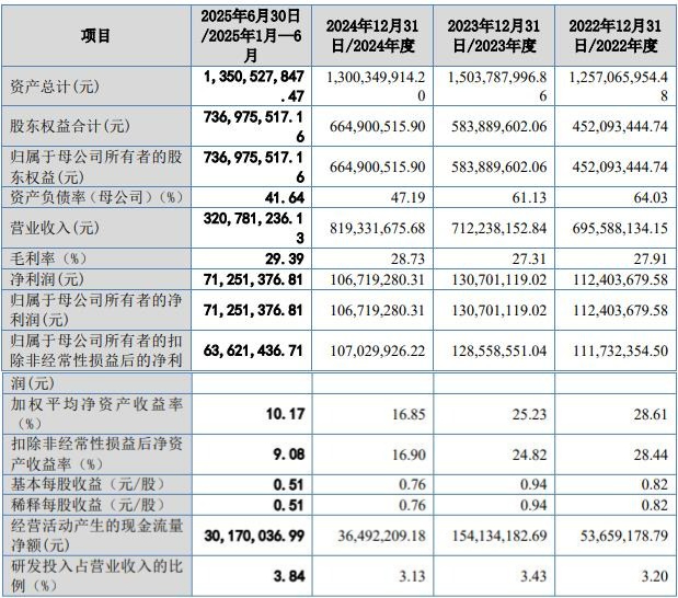主要财务数据:2022年-2025年6月末,报告期内,公司营业收入分别为69,558.81万元、71,223.82万元、81,933.17万元与32,078.12万元,呈平稳增长趋势。