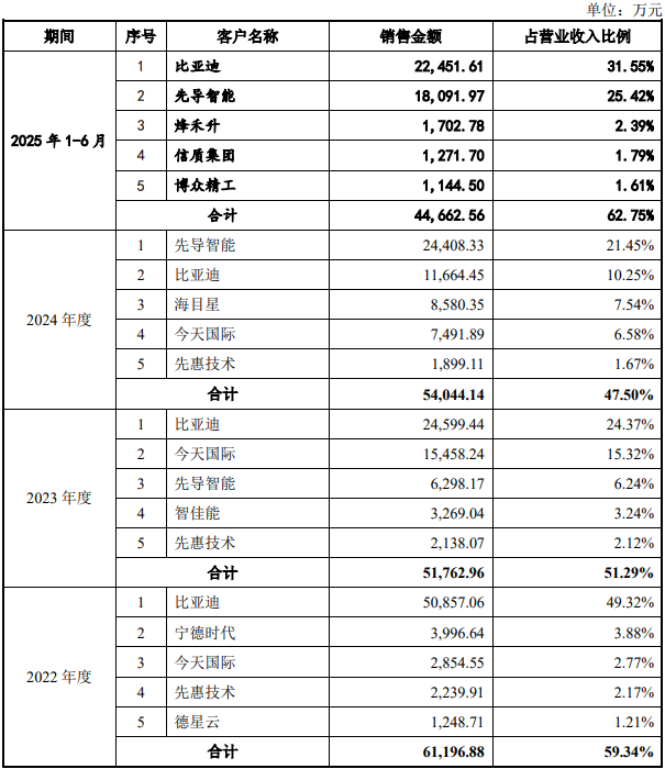 前五大客户:2022年—2025年6月末,报告期内,公司向前五名客户的合计销售收入占营业收入的比例分别为 59.34%、 51.29%、47.50%和 62.75%,公司向主要客户销售的集中度相对较高。