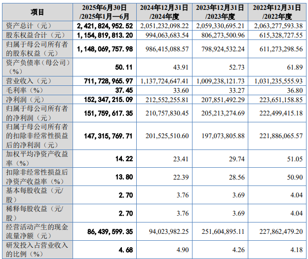 主要财务数据:2022年—2025年6月末,报告期内,公司实现营业收入分别为103,123.56万元、100,923.81万元、113,772.46万元和 71,172.90万元。