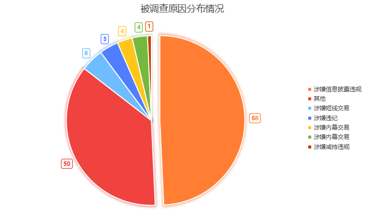 从被调查原因来看,68家公司涉嫌信息披露违法违规,占比达到49.28%。此外,还有6家公司涉嫌短线交易,5家公司涉嫌违纪,4家公司涉嫌内幕交易,4家涉嫌财务造假,1家涉嫌减持违规,50家涉及其他原因被立案。