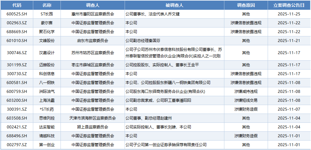 11月以来,a股已有15家上市公司被立案调查,这一数量较10月的7家、9月的12家有明显增加的势头,显示出监管对资本市场违法违规行为的查处力度持续加大。